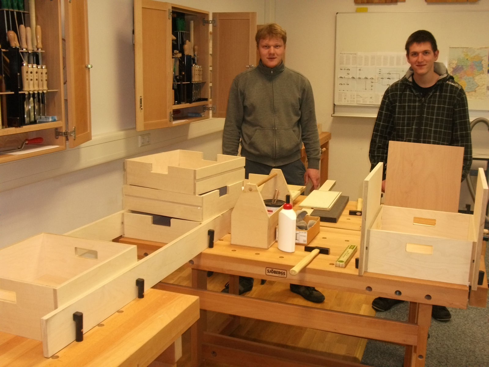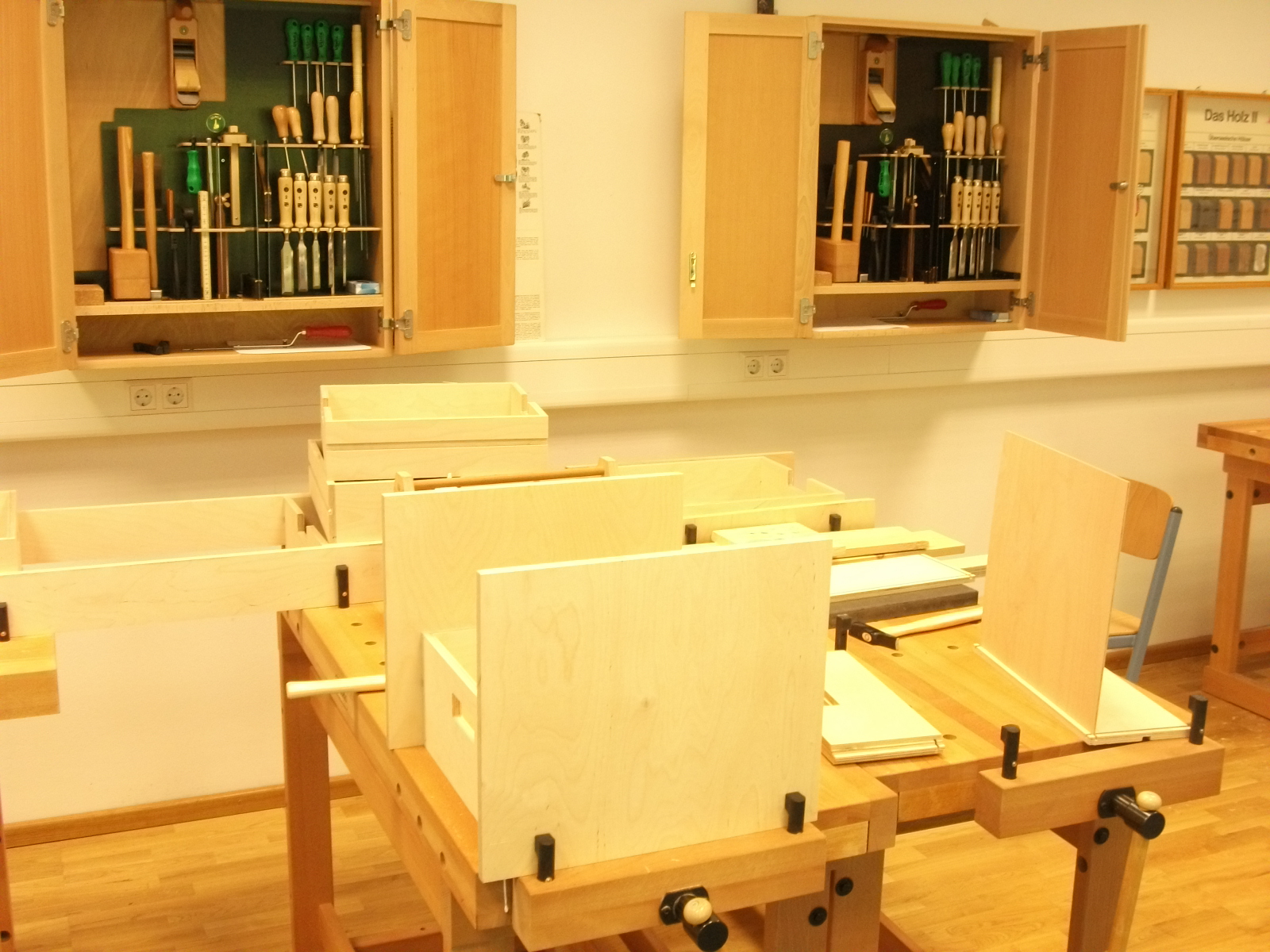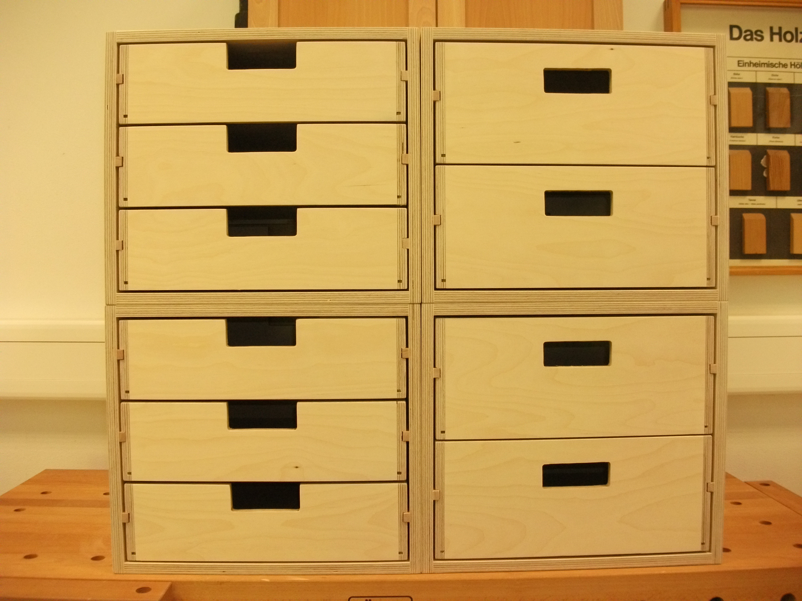 Für die Aufbewahrung von Kleinmaterial (Beschläge, Musterteile) wurden stapelbare Materialboxen mit einfachen Schüben (Tablettauszügen) benötigt. Dazu wurden zunächst Konstruktionszeichnungen, Materiallisten und ein CNC-Programm erstellt.