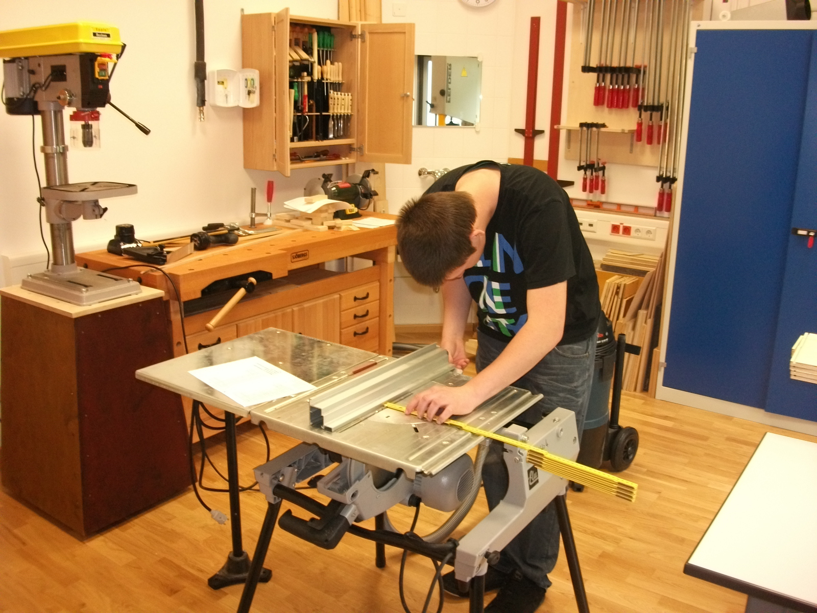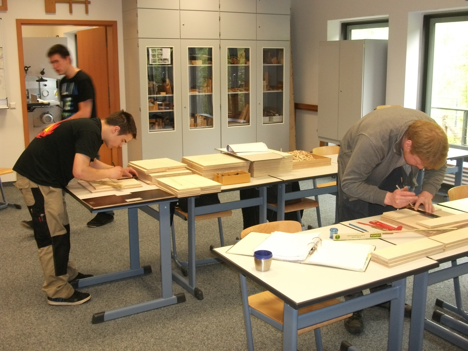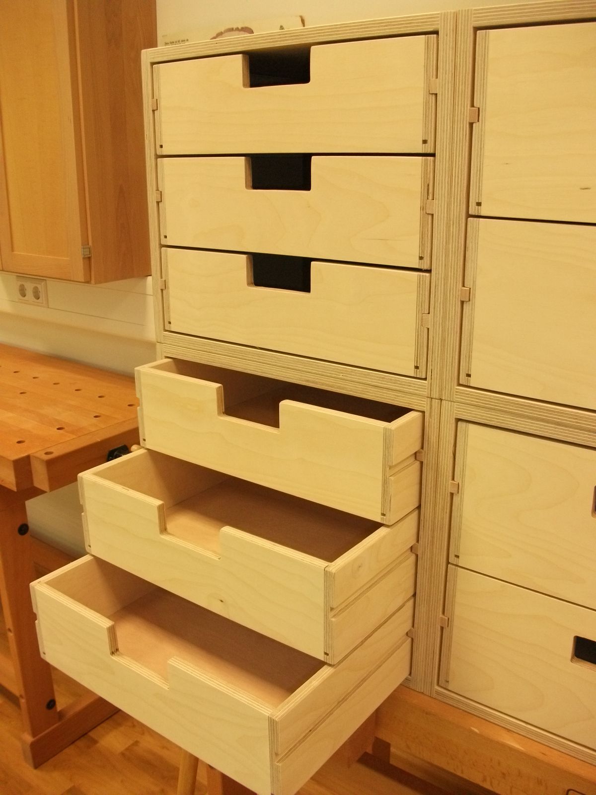 Für die Aufbewahrung von Kleinmaterial (Beschläge, Musterteile) wurden stapelbare Materialboxen mit einfachen Schüben (Tablettauszügen) benötigt. Dazu wurden zunächst Konstruktionszeichnungen, Materiallisten und ein CNC-Programm erstellt.